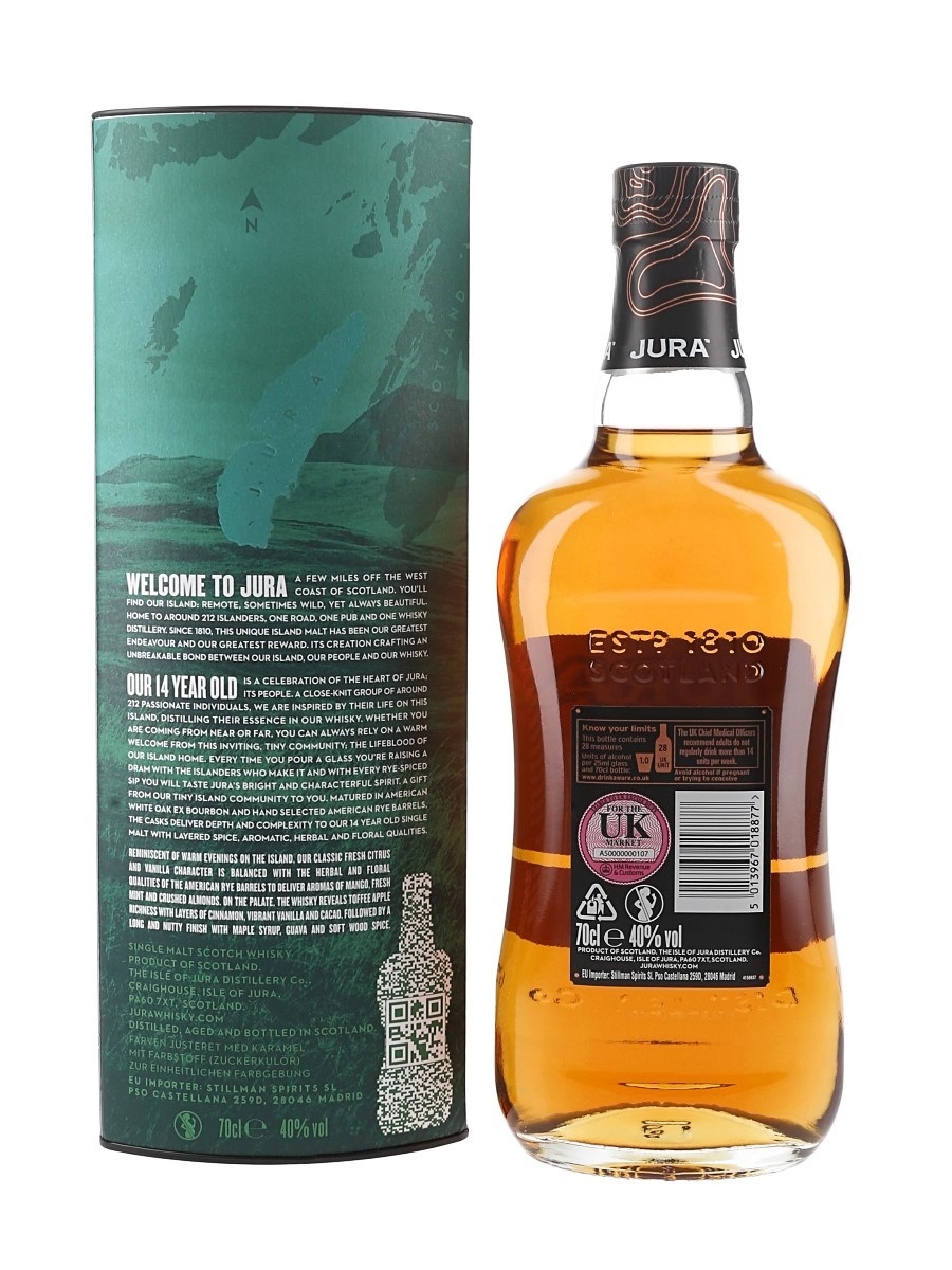 A bottle of Jura 14 Year Old Single Malt Scotch Whisky. This was matured in American white bourbon barrels and Hand Selected American Rye Barrels.