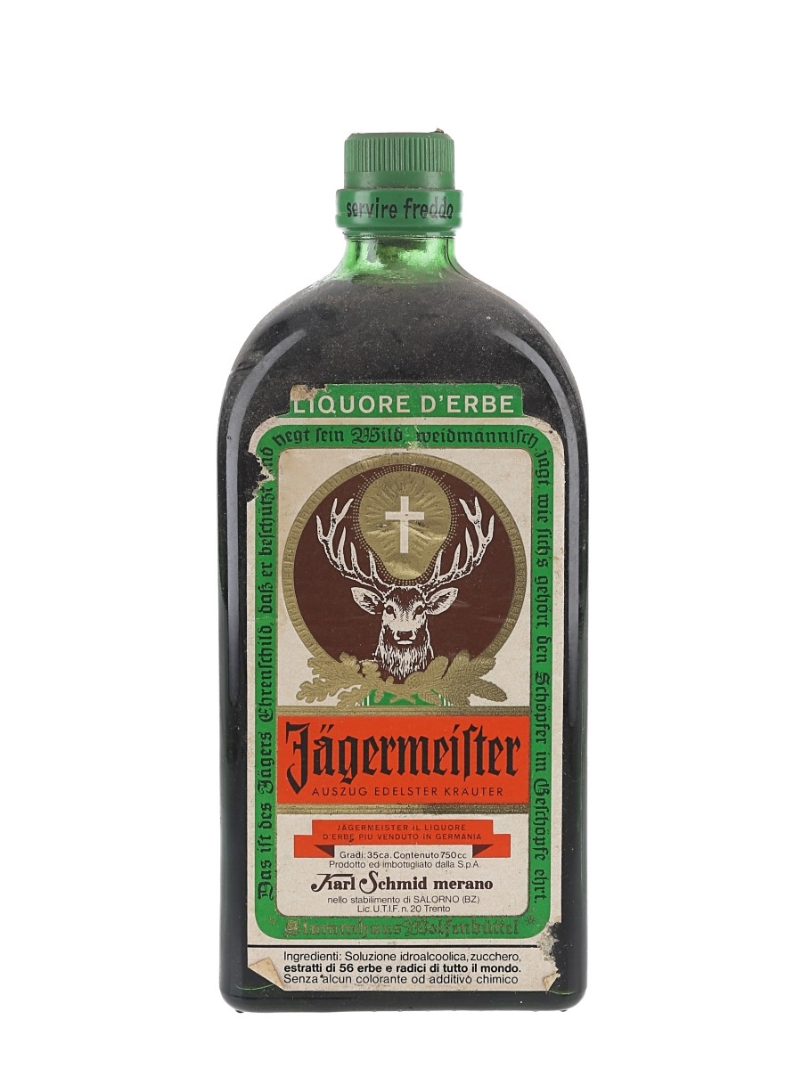 A bottle of Jägermeister herbal liqueur produced in Italy by Karl Schmid. We estimate this was bottled in the 1970s.