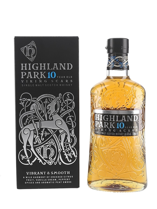 A bottle of Highland Park 10 Year Old Viking Scars Single Malt Scotch Whisky from Orkney, distilled and bottled by Highland Park Distillery.