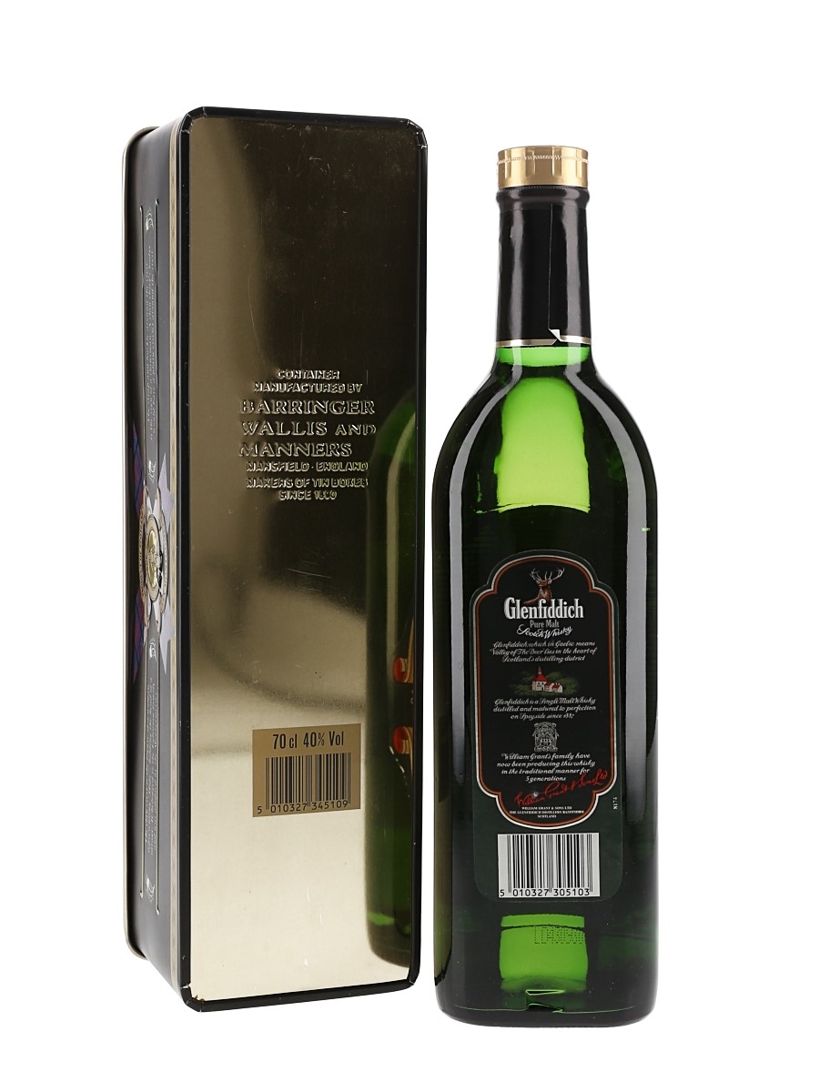 A bottle of Glenfiddich Special Old Reserve Single Malt Scotch Whisky, distilled, matured and bottled by William Grant & Sons Ltd. and presented in a Clans of the Highlands of Scotland presentation tin.