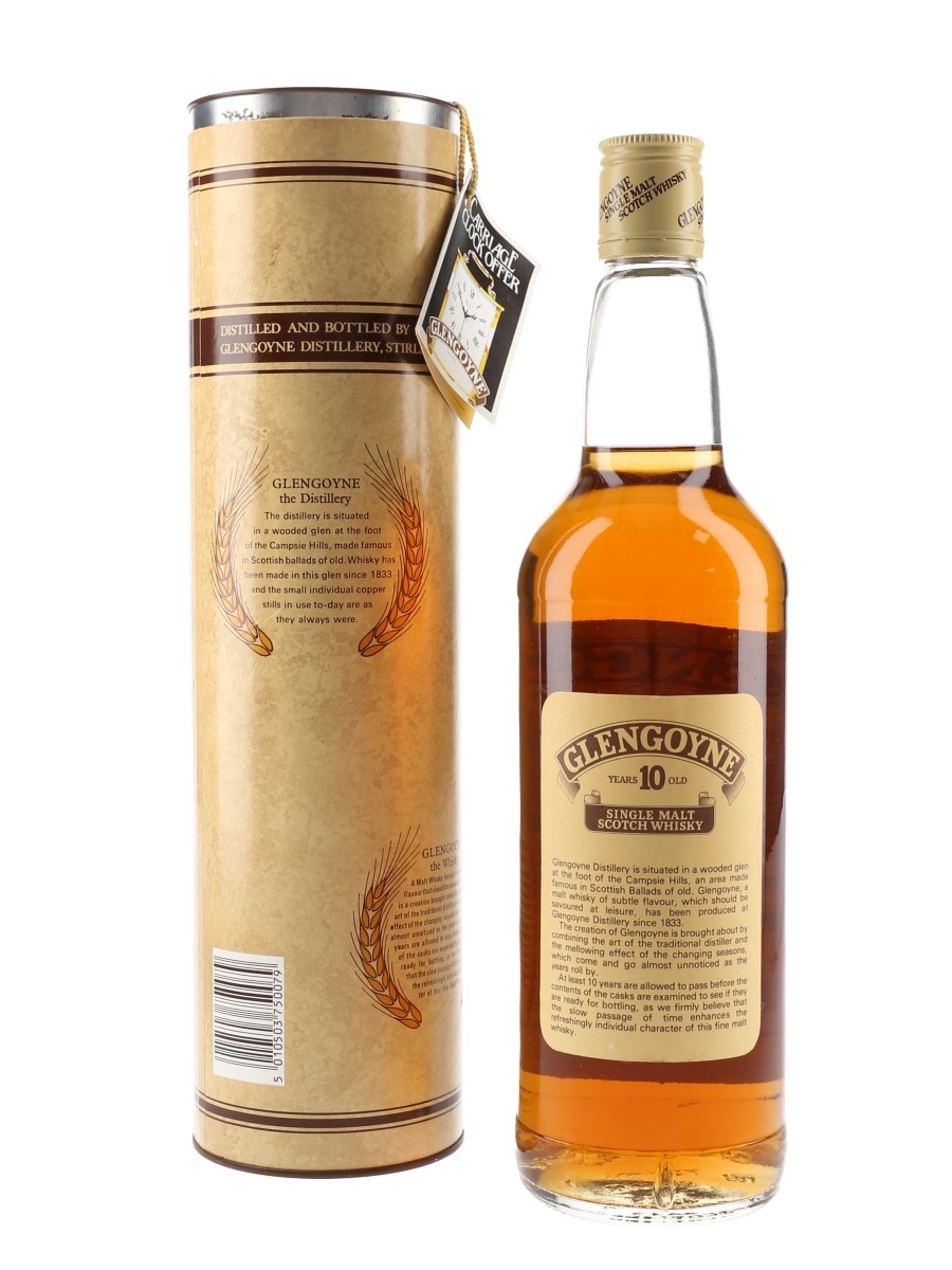 A bottle of Glengoyne 10 Year Old Pure Malt Scotch Whisky. This was produced and bottled by Lang Brothers Limited, we estimate in the 1980s.