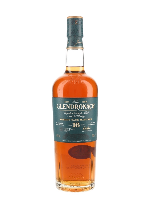 A bottle of Glendronach 16 Year Old Single Malt Scotch Whisky. This was matured in a combination of Pedro Ximénez and Oloroso sherry casks, along with Spanish oak casks.