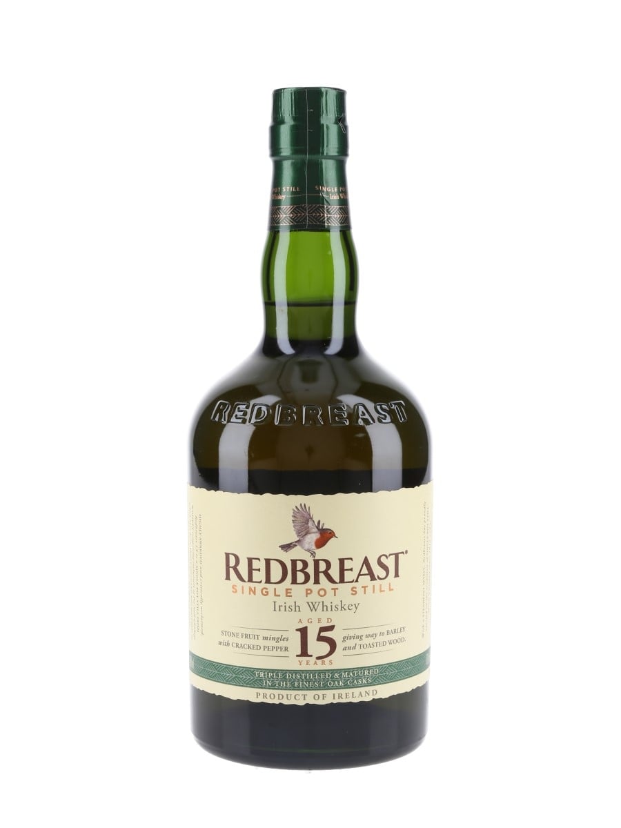 A bottle of Redbreast 15 Year Old Irish Single Pot Still Whiskey, produced at the Midleton Distillery in Cork. The bottling code indicates that this was bottled in 2025.