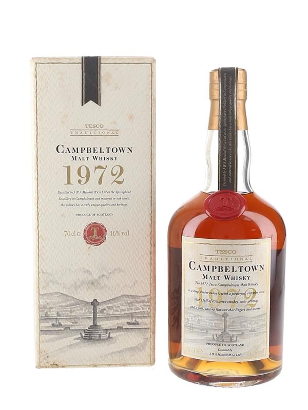 A bottle of Campbeltown 1972 Single Malt Scotch Whisky. This was produced by J & A Mitchell at the Springbank distillery for UK supermarket chain Tesco stores. We estimate this was bottled in the early 1990s.