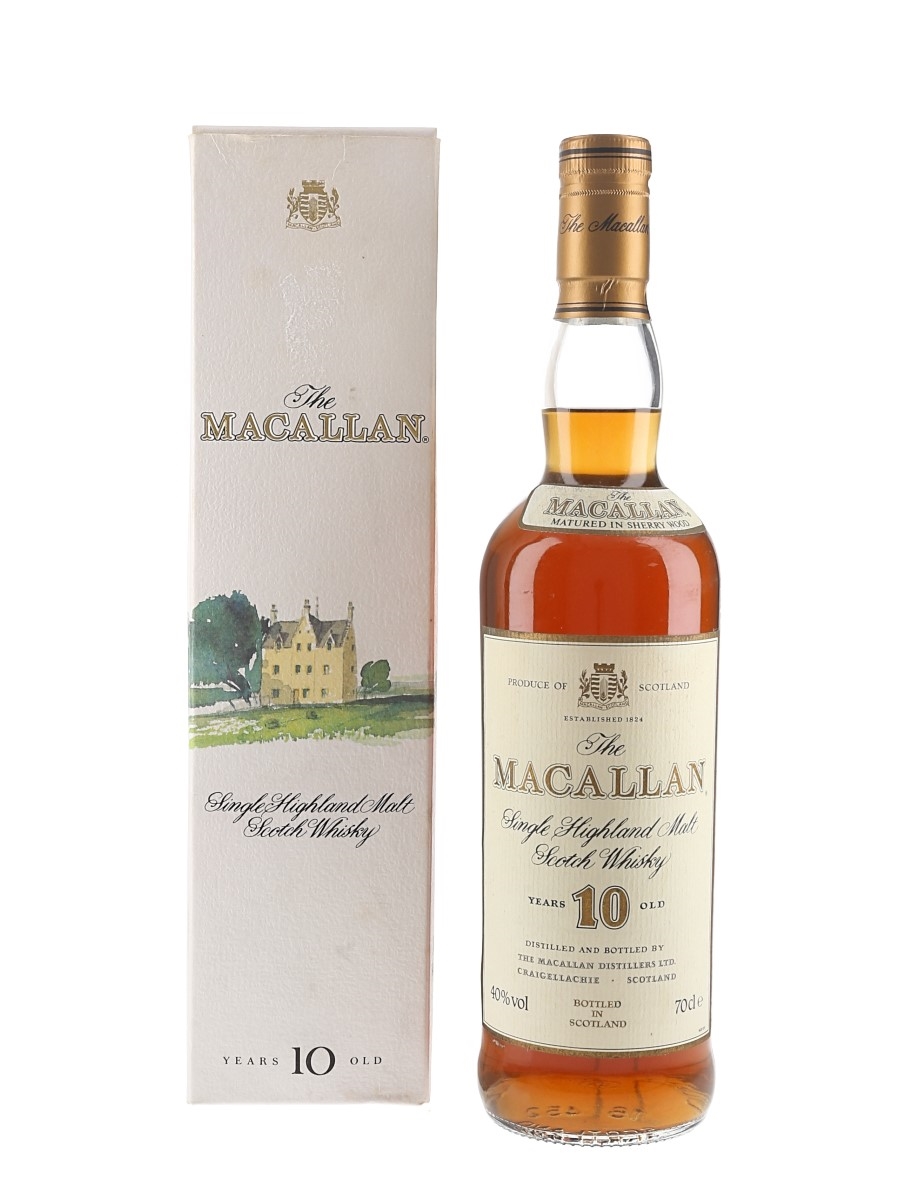 A bottle of The Macallan 10 Year Old Single Highland Malt Scotch Whisky exclusively matured in selected sherry casks from Jerez, Spain. We estimate this was bottled in the 1990s.