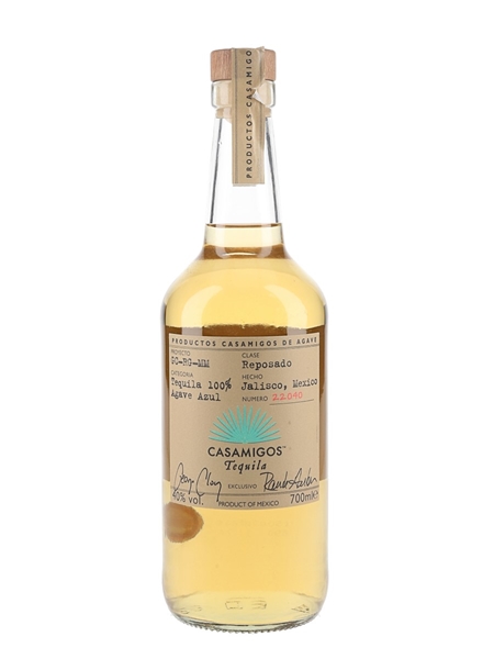 A bottle of Casamigos Reposado tequila produced in Jalisco, Mexico, for Cellar Trends Limited. This was aged for seven months in reconditioned American white oak whiskey casks.