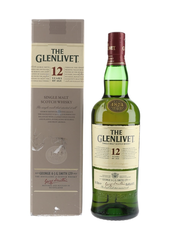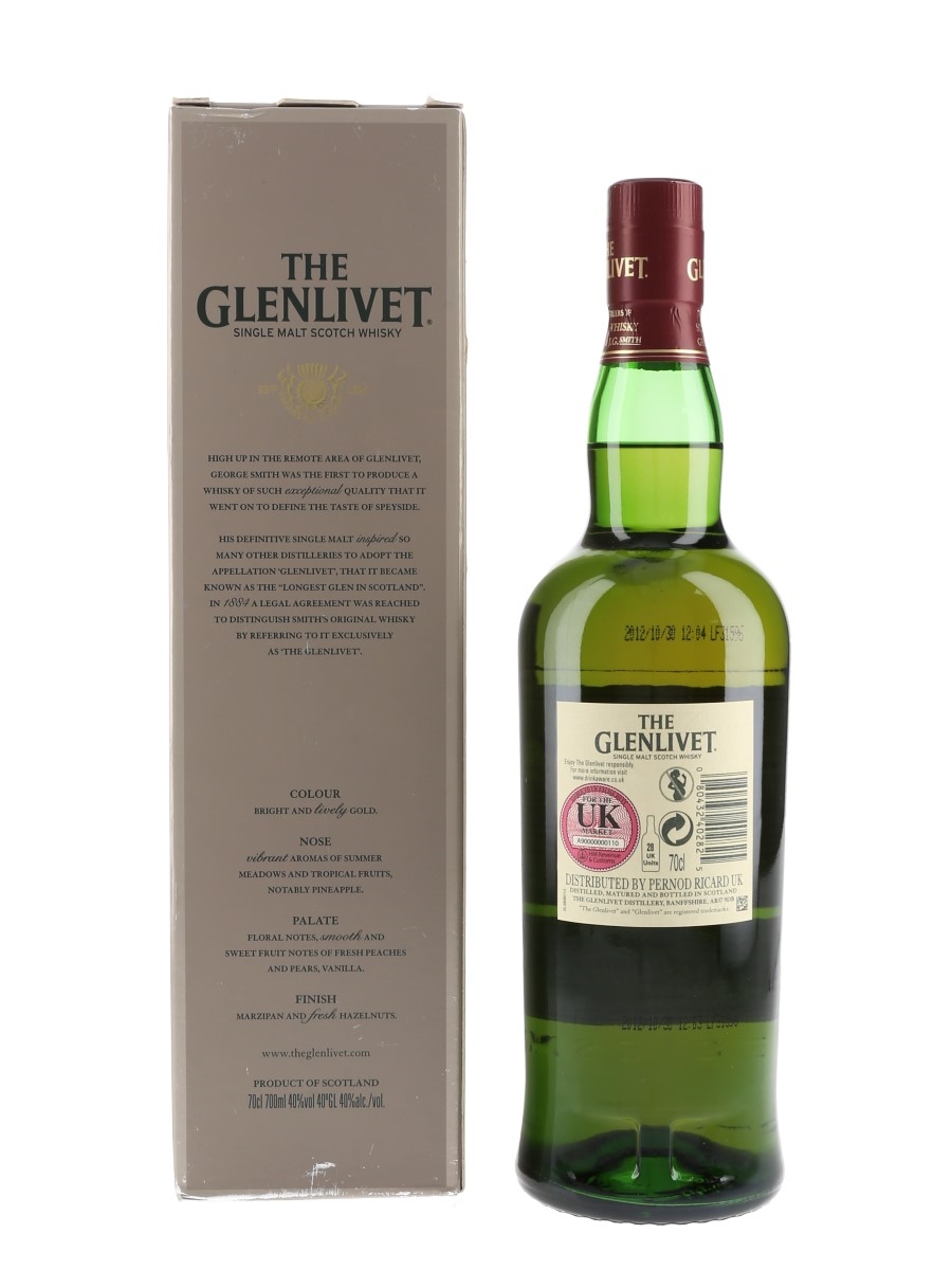 A bottle of The Glenlivet 12 Year Old Single Malt Scotch Whisky. The bottling code indicates this was bottled in 2012