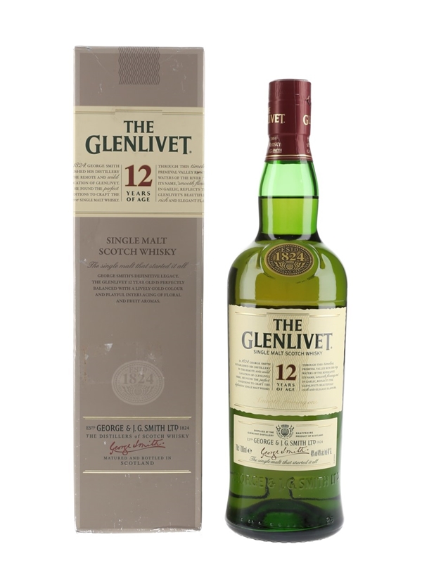 A bottle of The Glenlivet 12 Year Old Single Malt Scotch Whisky. The bottling code indicates that this was bottled in 2012