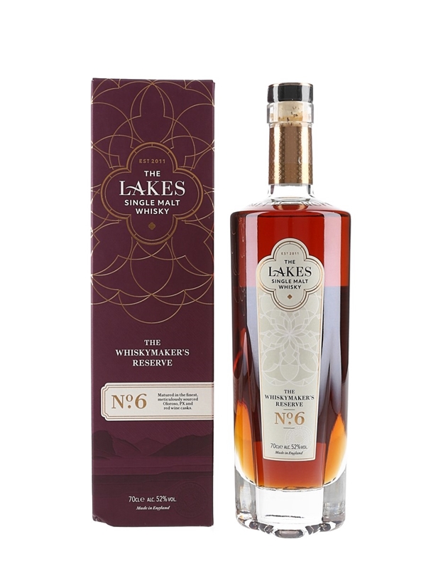 A bottle of The Lakes The Whisky Maker's Reserve No.6 English Single Malt Whisky. This was matured in a combination of Oloroso, Pedro Ximenez and red wine casks, comprising Spanish and American oak.