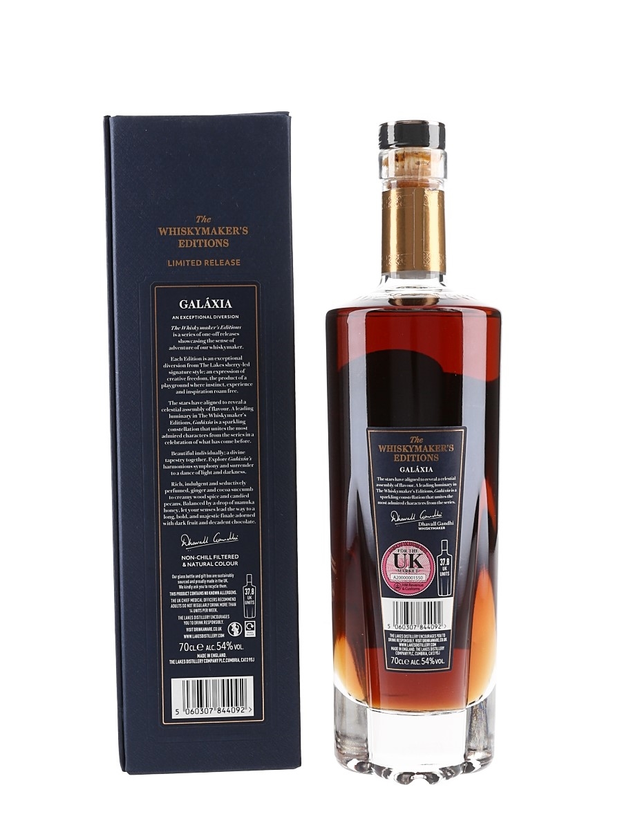 A bottle of The Lakes Single Malt The Whisky Maker's Editions Galaxia, bottled at 54% ABV.