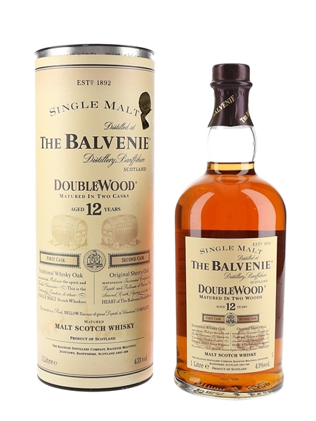 A litre bottle of The Balvenie 12 Year Old Doublewood Single Malt Scotch Whisky. This was matured first in traditional whisky oak casks, followed by a period of ageing in sherry casks. We estimate this was bottled in the 2000s.
