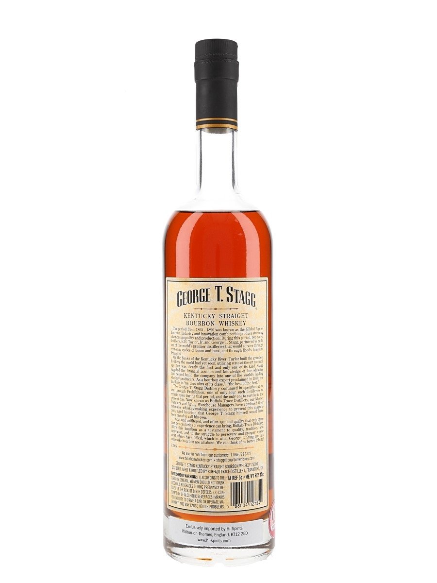 A bottle of George T Stagg Barrel Proof Kentucky Straight Bourbon Whiskey, bottled at 64.6% ABV for Buffalo Trace's Antique Collection in 2017.