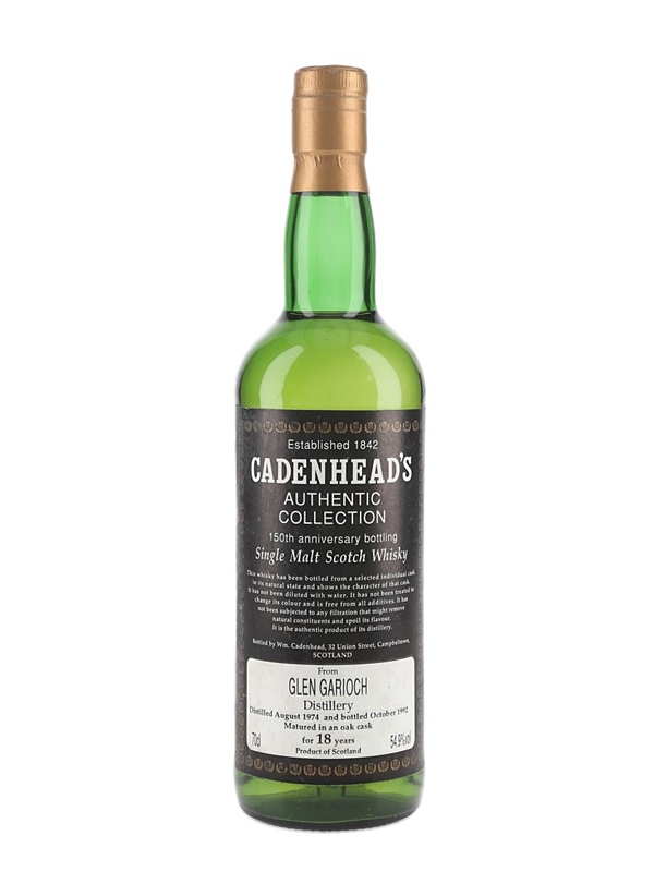A bottle of Glen Garioch 18 Year Old Single Malt Scotch Whisky. This was distilled in August 1974 and bottled at 54.9% ABV in October 1992 for Cadenhead's Authentic Collection.