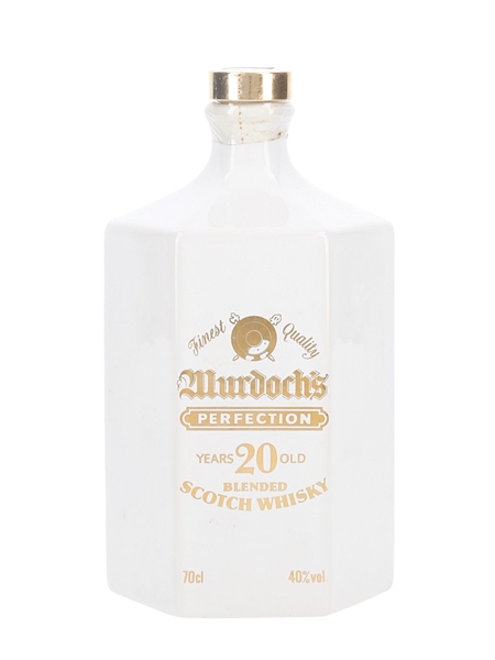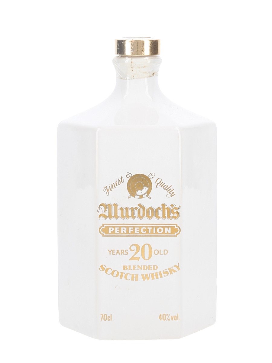 A white ceramic decanter of Murdoch's Perfection 20 Year Old blended Scotch whisky. We estimate this decanter was bottled in the 1990s.