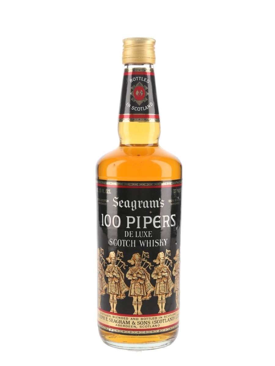 A bottle of Seagram's 100 Pipers De Luxe Scotch Whisky, produced and bottled by Joseph E Seagram & Sons Ltd. We estimate this was bottled in the 1970s.