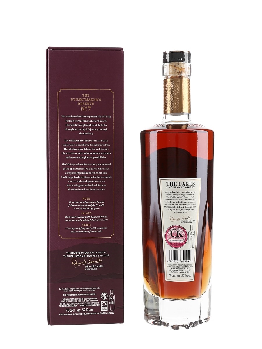 A bottle of The Lakes The Whiskymaker's Reserve No.7 Single Malt Whisky produced in England at The Lakes Distillery. This was matured in a combination of PX, Oloroso and Red Wine casks and bottled at 52% ABV. The bottling code indicates this was bottled on the 19 April 2023.