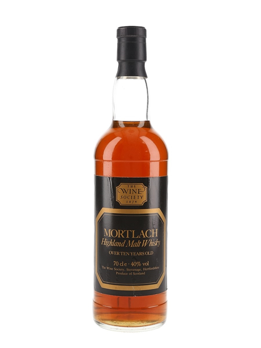 A bottle of Mortlach 10 Year Old Single Malt Scotch Whisky. This was bottled by The Wine Society, we estimate in the 1990s.