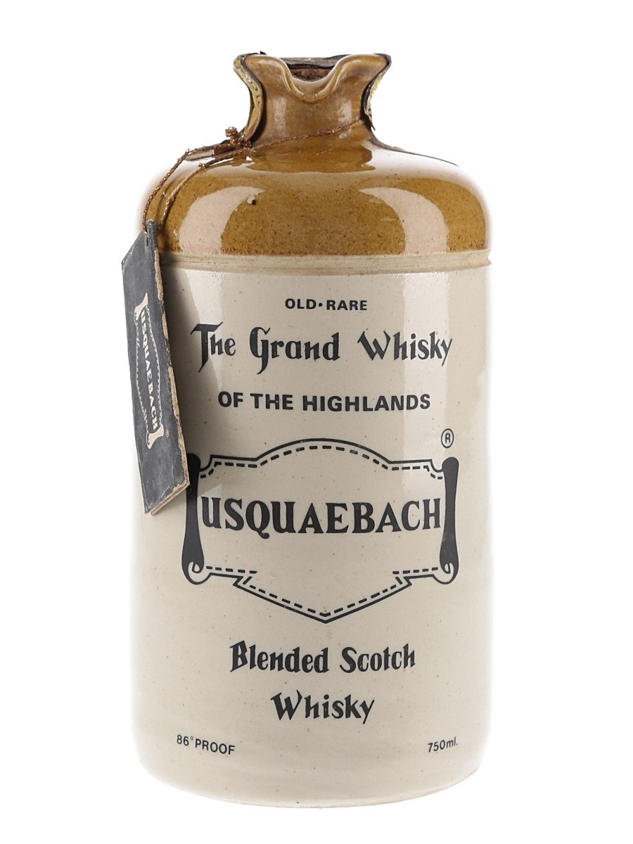A bottle of Usquaebach Old Rare Blended Scotch Whisky presented in a stoneware flagon. This was blended and bottled by Douglas Laing & Co. Ltd. for Twelve Stone Flagons, USA. We estimate this was bottled in the 1980s.