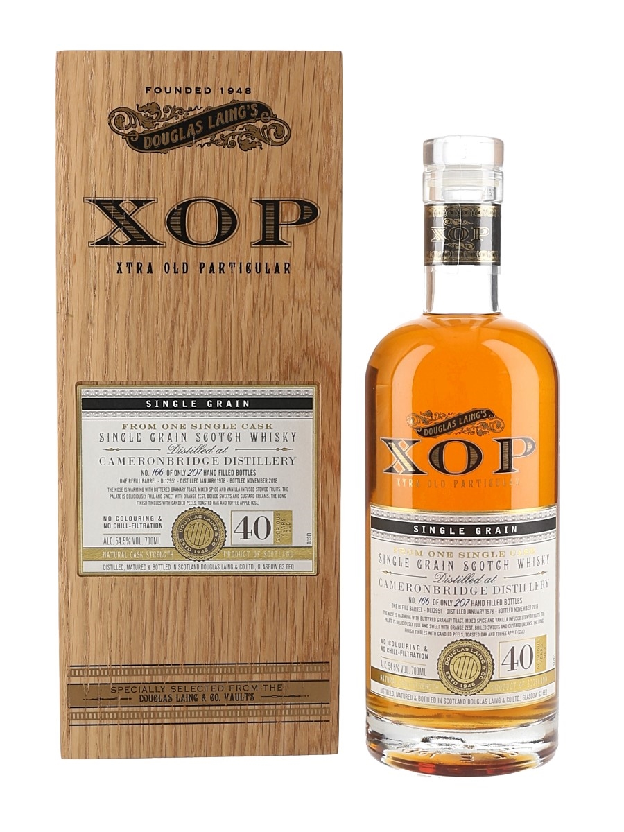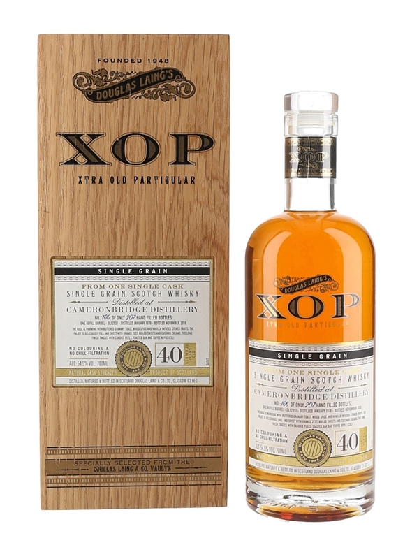 A limited edition bottle of Cameronbridge 40 Year Single Grain Scotch Whisky. This was distilled in January 1978, matured in a single refill barrel and bottled in December 2018 by Douglas Laing as part of the Xtra Old Particular series.