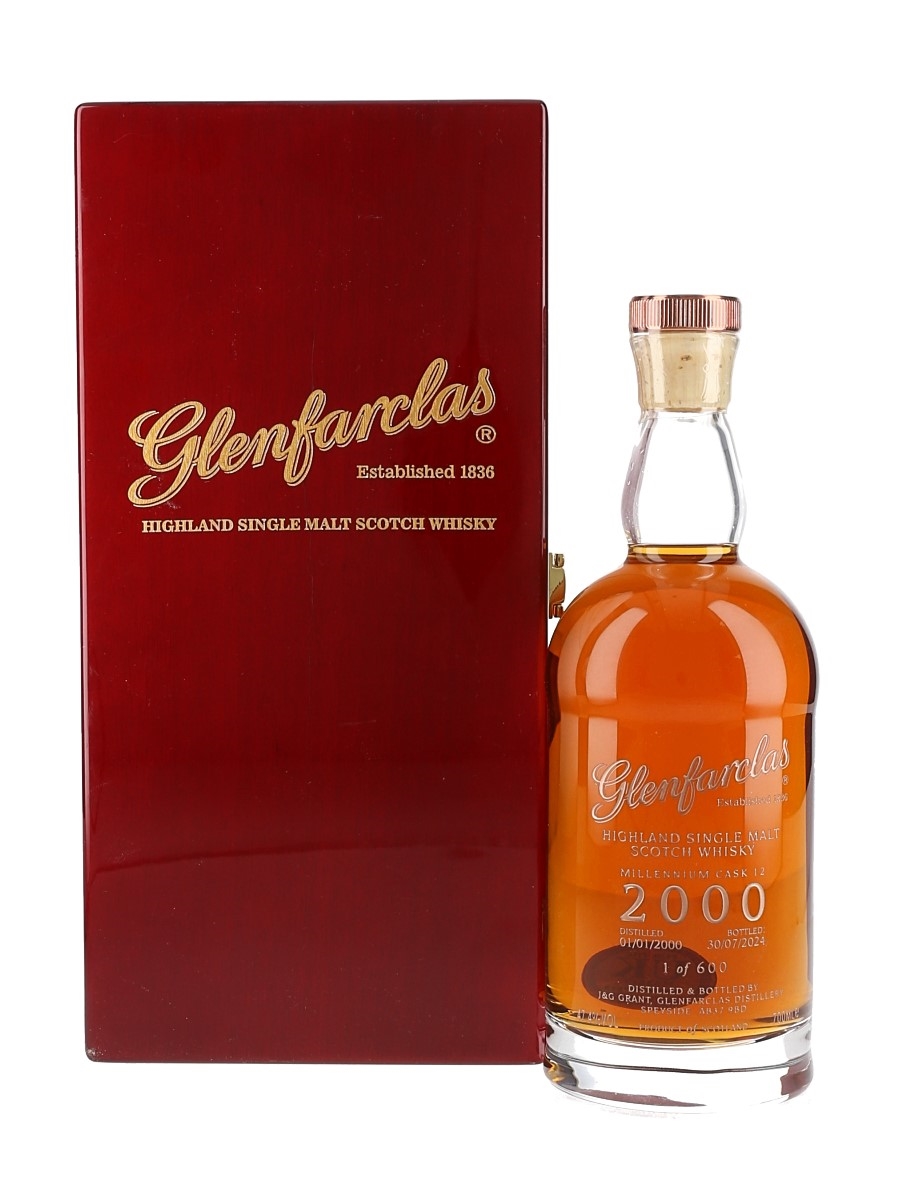 A bottle of Glenfarclas 2000 Millennium Cask Highland Single Malt Scotch Whisky. This was distilled on 01 January 2000 and bottled on 30 July 2024.