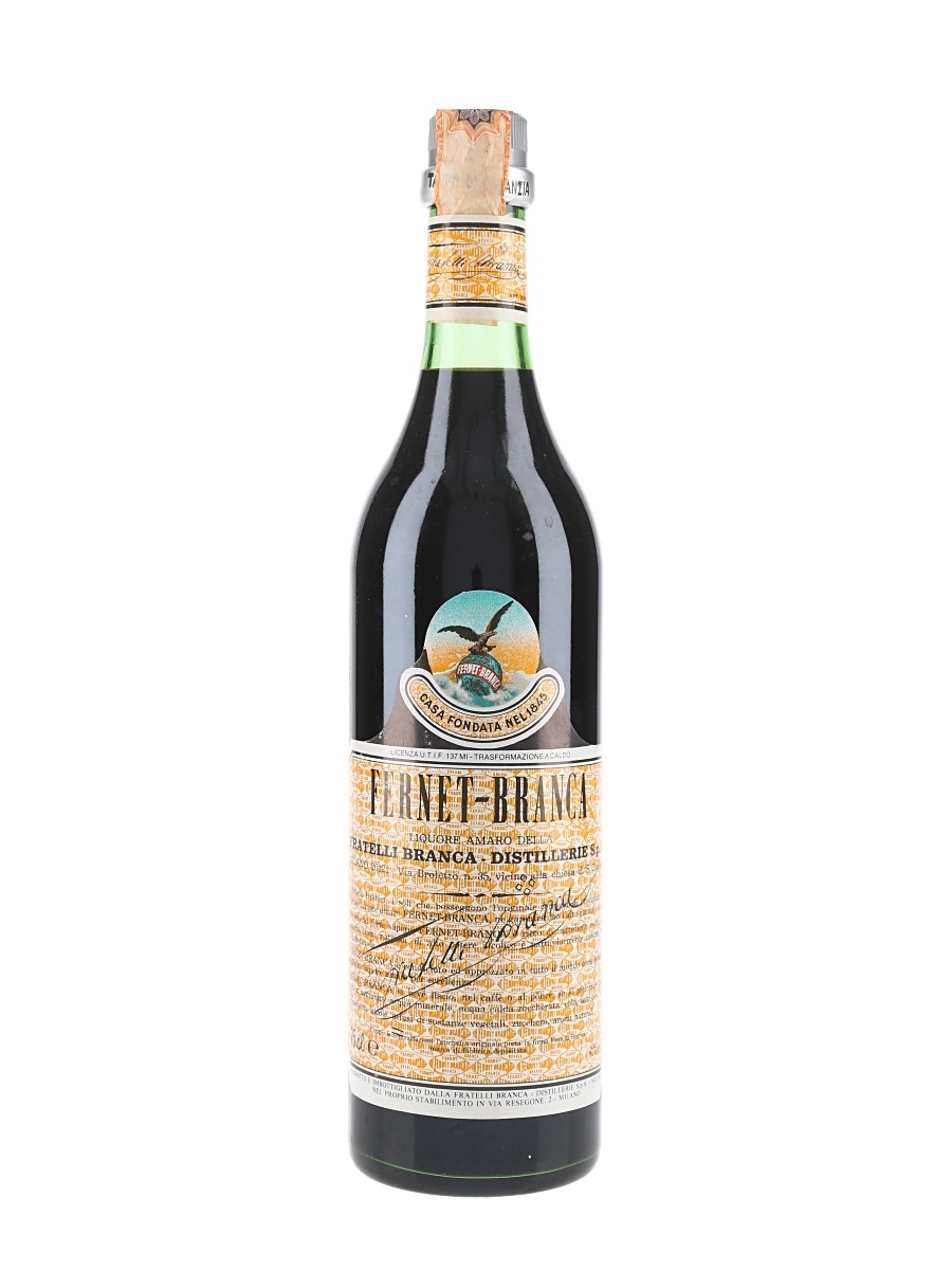 A bottle of Fernet-Brance herbal liqueur produced at Fratelli Branca distillery, Italy. We estimate this was bottled in the 1980s.