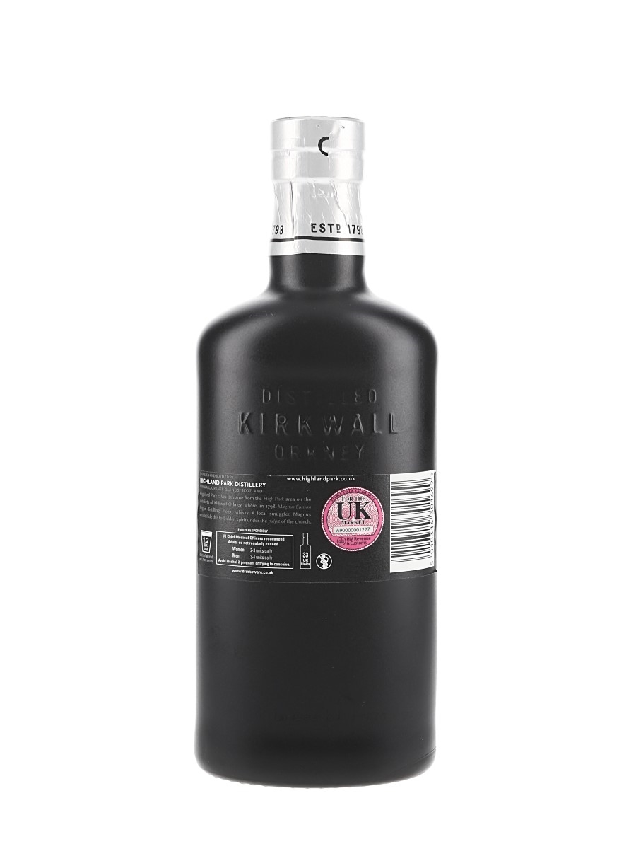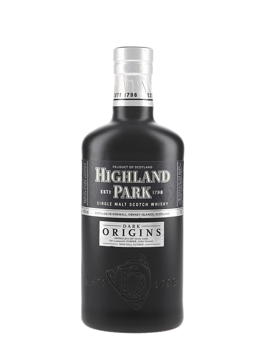 A bottle of Highland Park Dark Origins Single Malt Scotch Whisky, a sherried expression which was matured in 80% first-fill sherry casks and 20% refill casks.