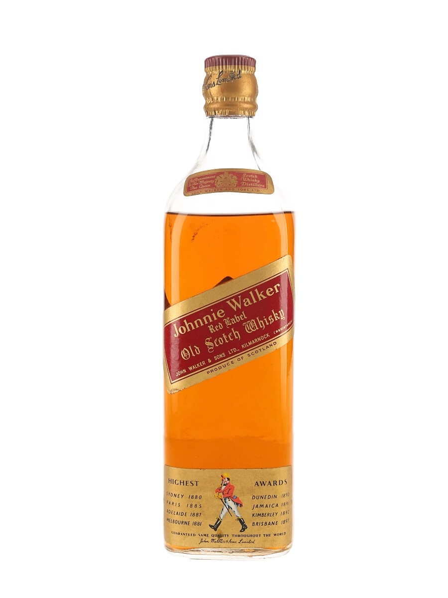 A bottle of Johnnie Walker Red Label Old Scotch Whisky, the world's best selling Scotch whisky produced by John Walker And Sons Ltd. We estimate this was bottled in the 1960s.