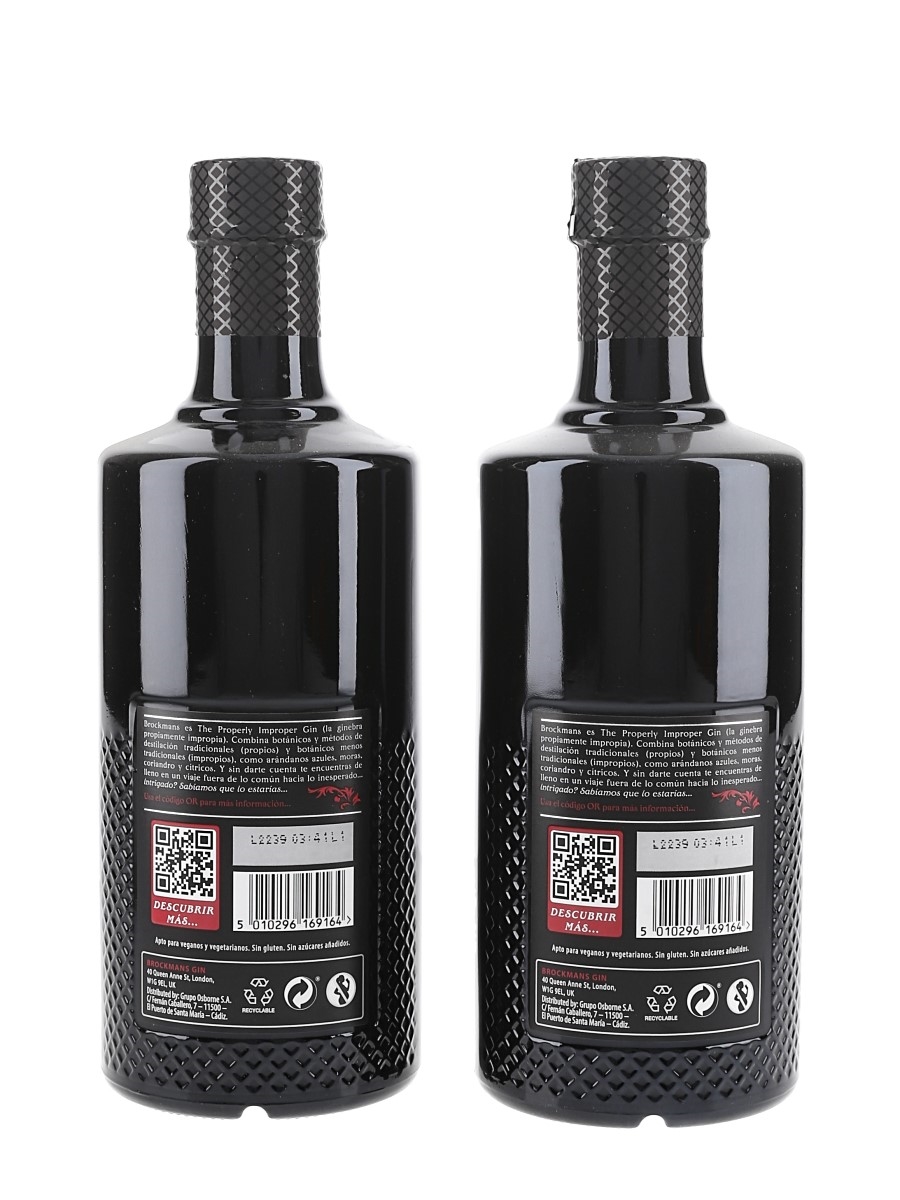 This lot contains two bottles of Brockmans Premium Gin, distilled in England from neutral grain spirit and infused with botanicals.