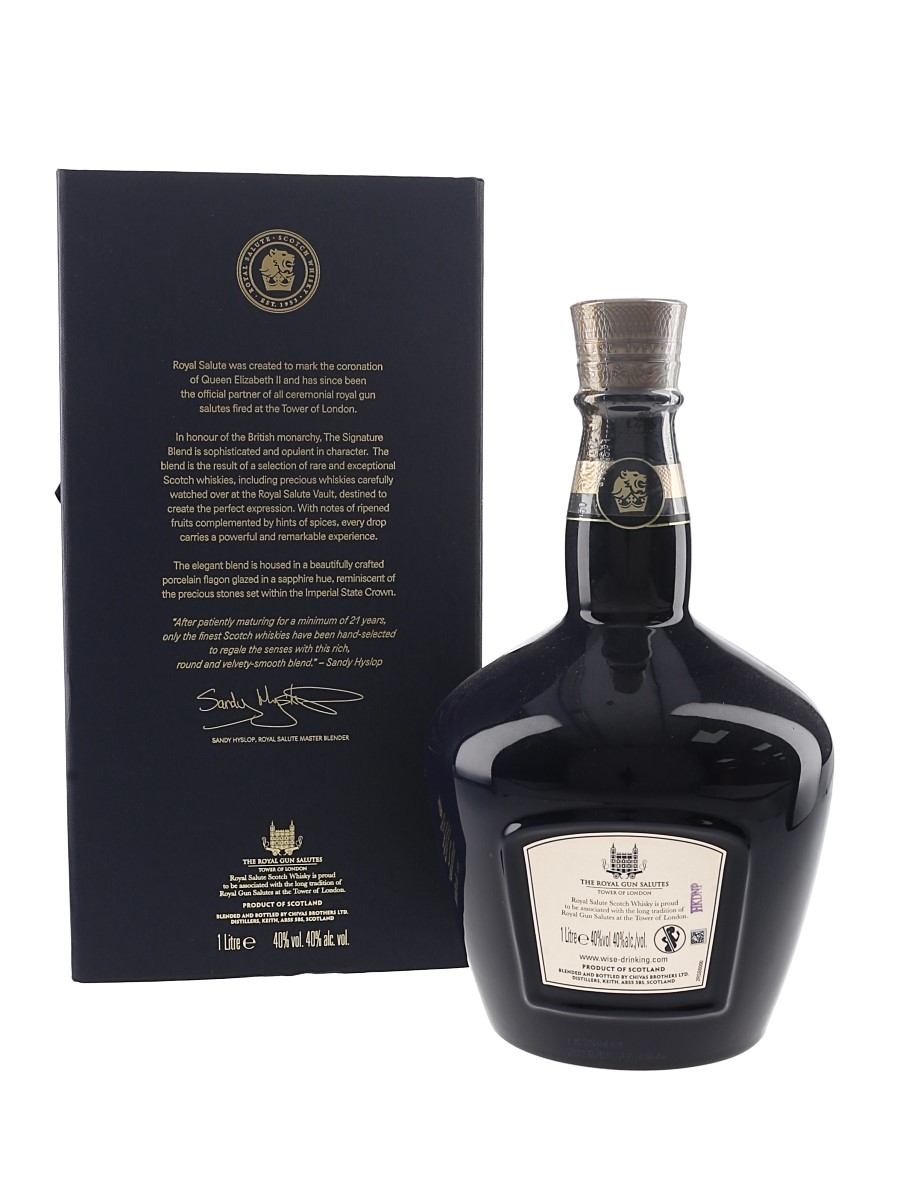 A litre bottle of Chivas Brothers' Royal Salute 21 Year Old Blended Scotch Whisky, The Signature Blend, presented in a blue Wade porcelain decanter. The bottling code indicates that this was bottled on 7 September 2019.