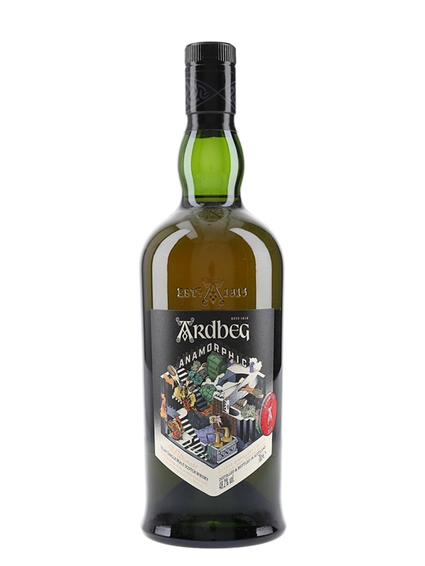 A bottle of Ardbeg Anamorphic The Ultimate Islay Single Malt Scotch Whisky, the Ardbeg Committee Only Edition of 2023. This was matured in heavily scored, toasted and fired casks and bottled at 48.2% ABV.