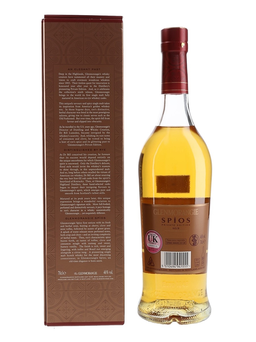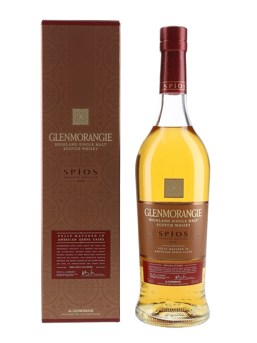 A bottle of Glenmorangie Spios Highland Single Malt Scotch Whisky, the ninth release in the Private Edition series. Spios is Gaelic for 'spice' and this is the first single malt to have been entirely matured in American rye whiskey casks.