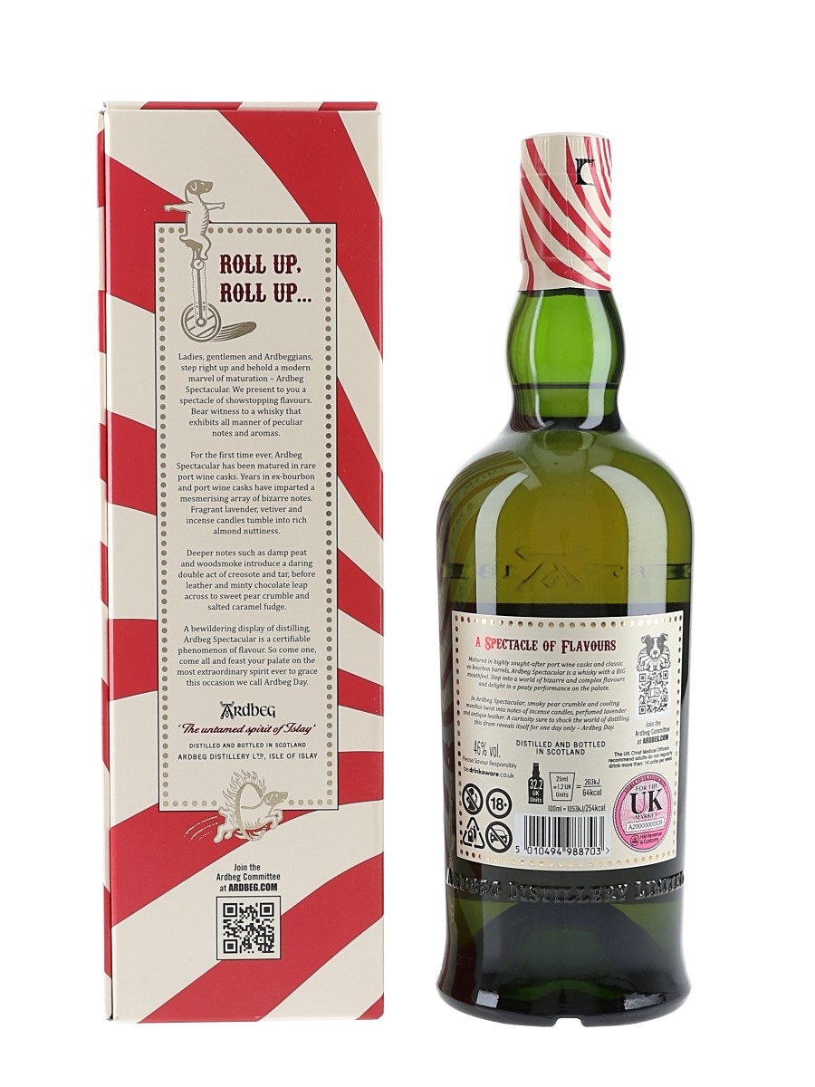 A bottle of Ardbeg Spectacular Islay Single Malt Scotch Whisky. This was matured in ex-bourbon casks & port casks and bottled exclusively for Ardbeg Fèis Ìsle Festival 2024 at 46% ABV.