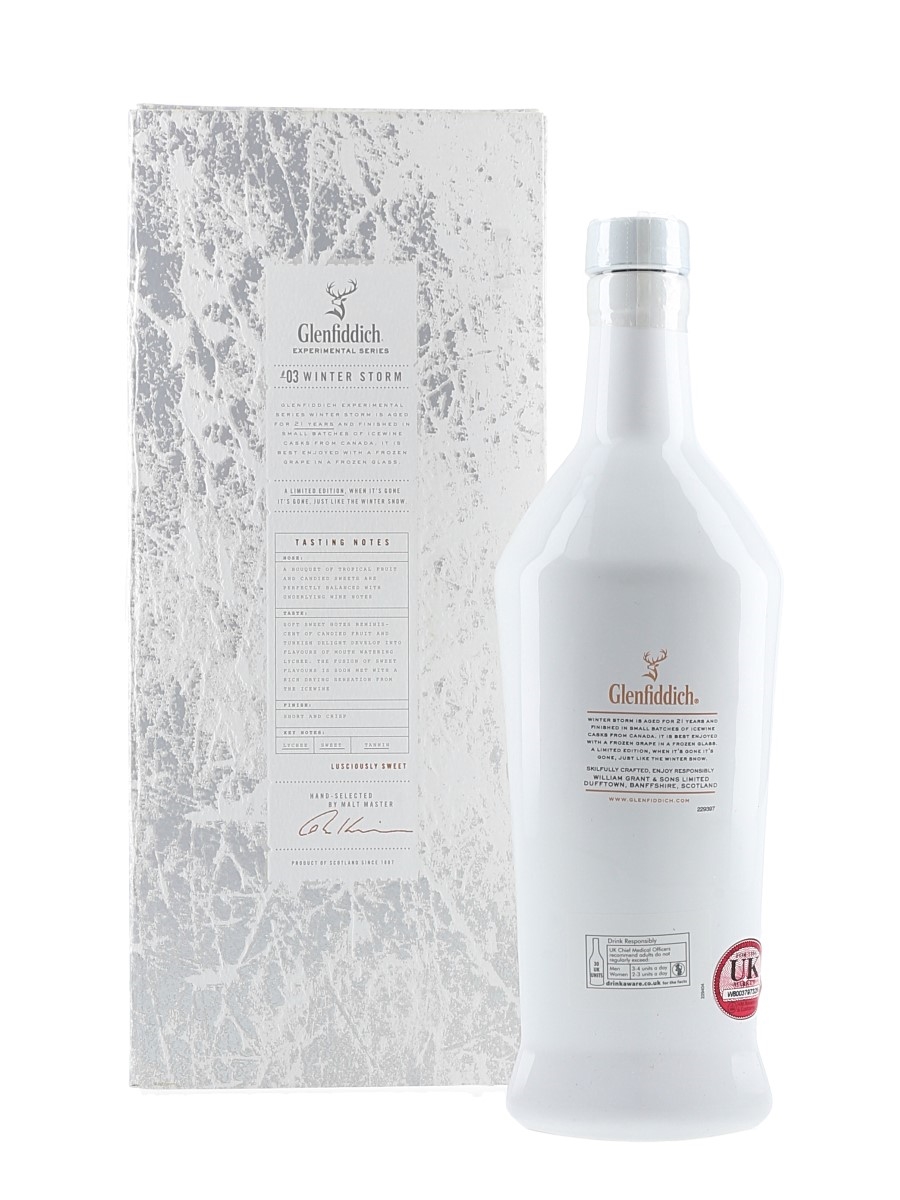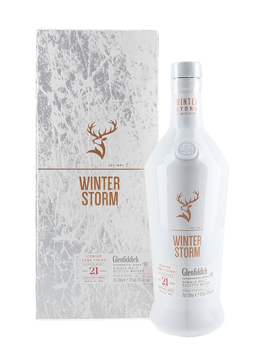 A limited edition bottle of Glenfiddich 21 Year Old Winter Storm Batch 2 Single Malt Scotch Whisky, the third entry in the Experimental Series. This was matured for 21 years and finished in small batches in Icewine casks from Canada.
