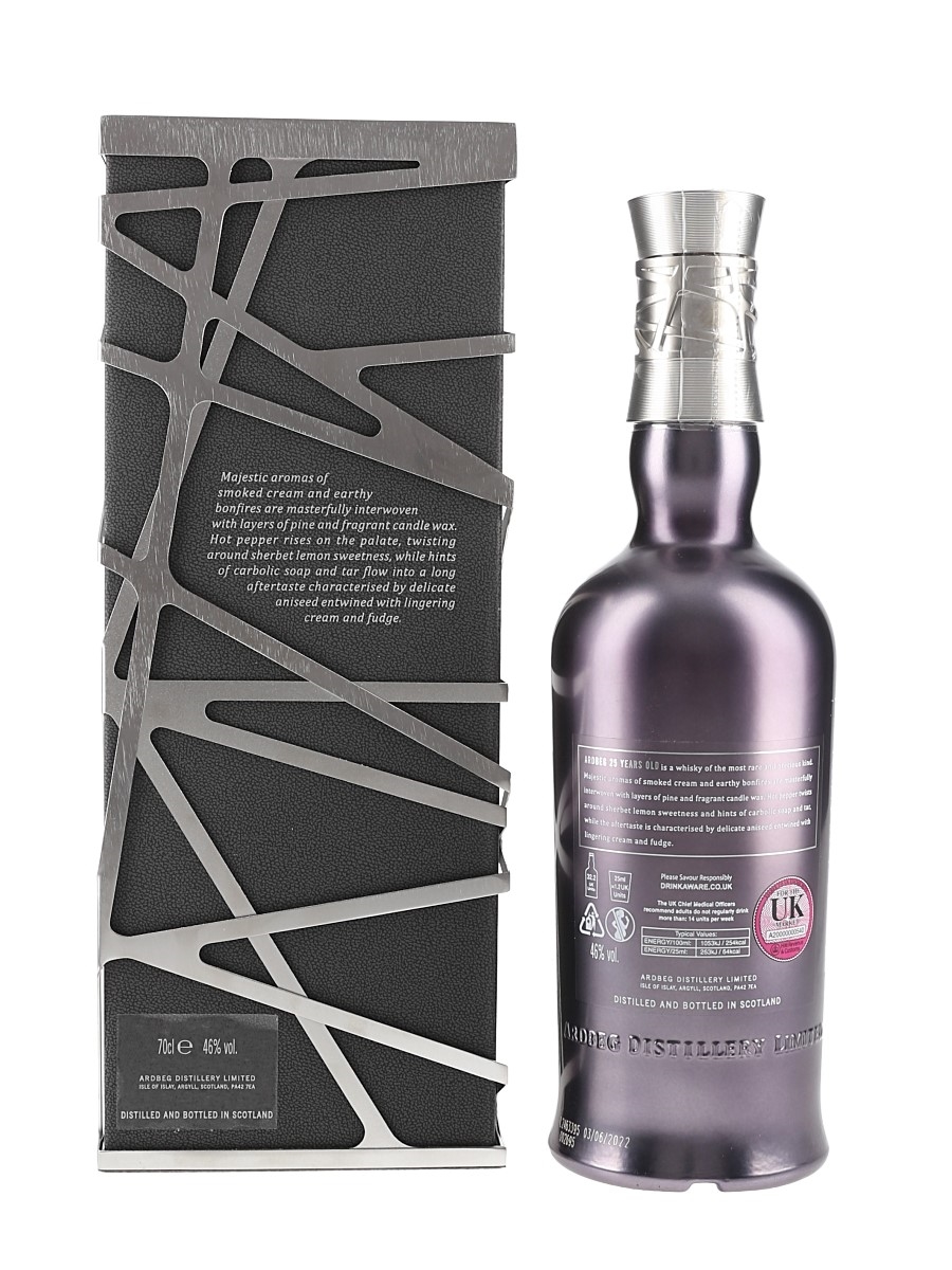 A bottle of Ardbeg 25 Year Old Islay Single Malt Scotch Whisky, bottled at 46% ABV. This was bottled on 3 June 2022 and is the oldest expression in Ardbeg's core range.