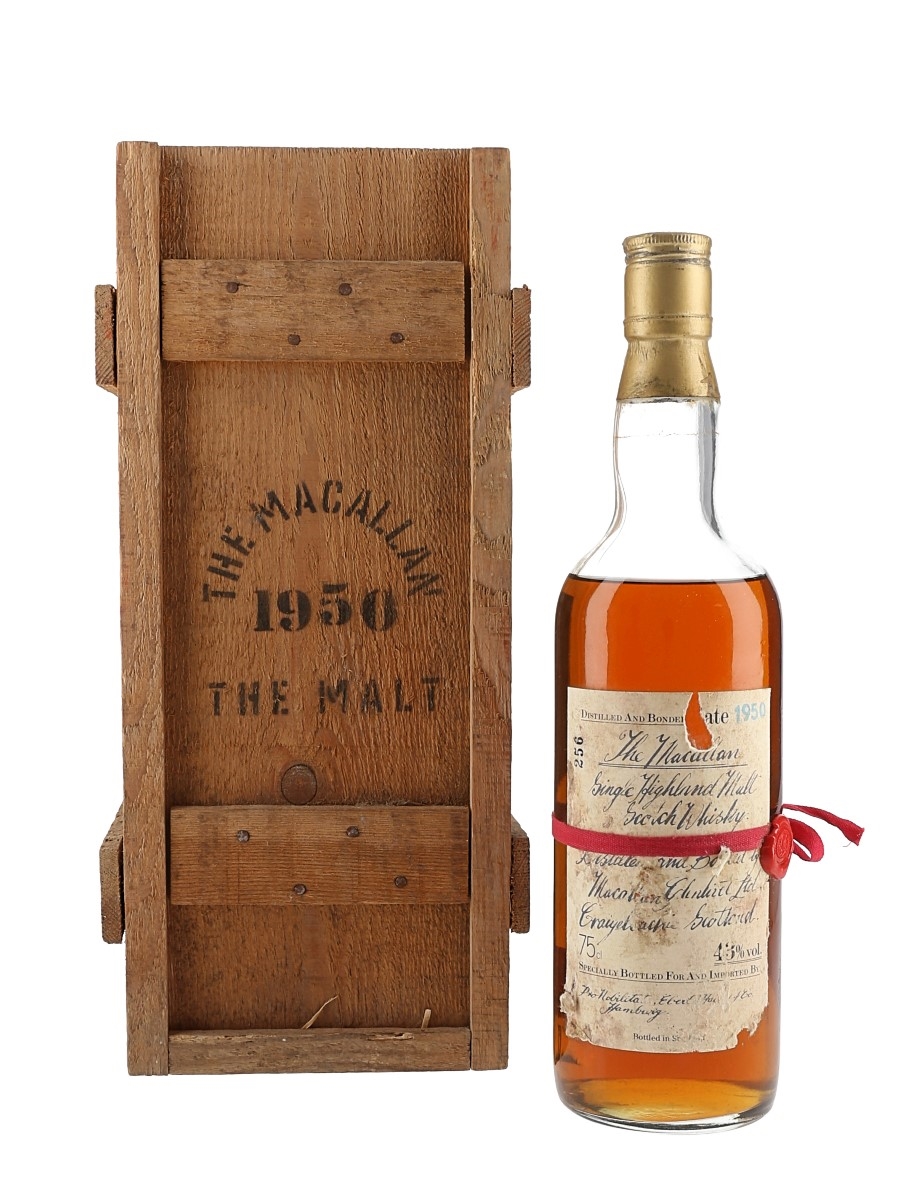 A bottle of The Macallan Single Highland Malt Scotch Whisky. This was distilled in 1950 and we estimate this was bottled in the early 1980s and distributed by Gordon & MacPhail.
