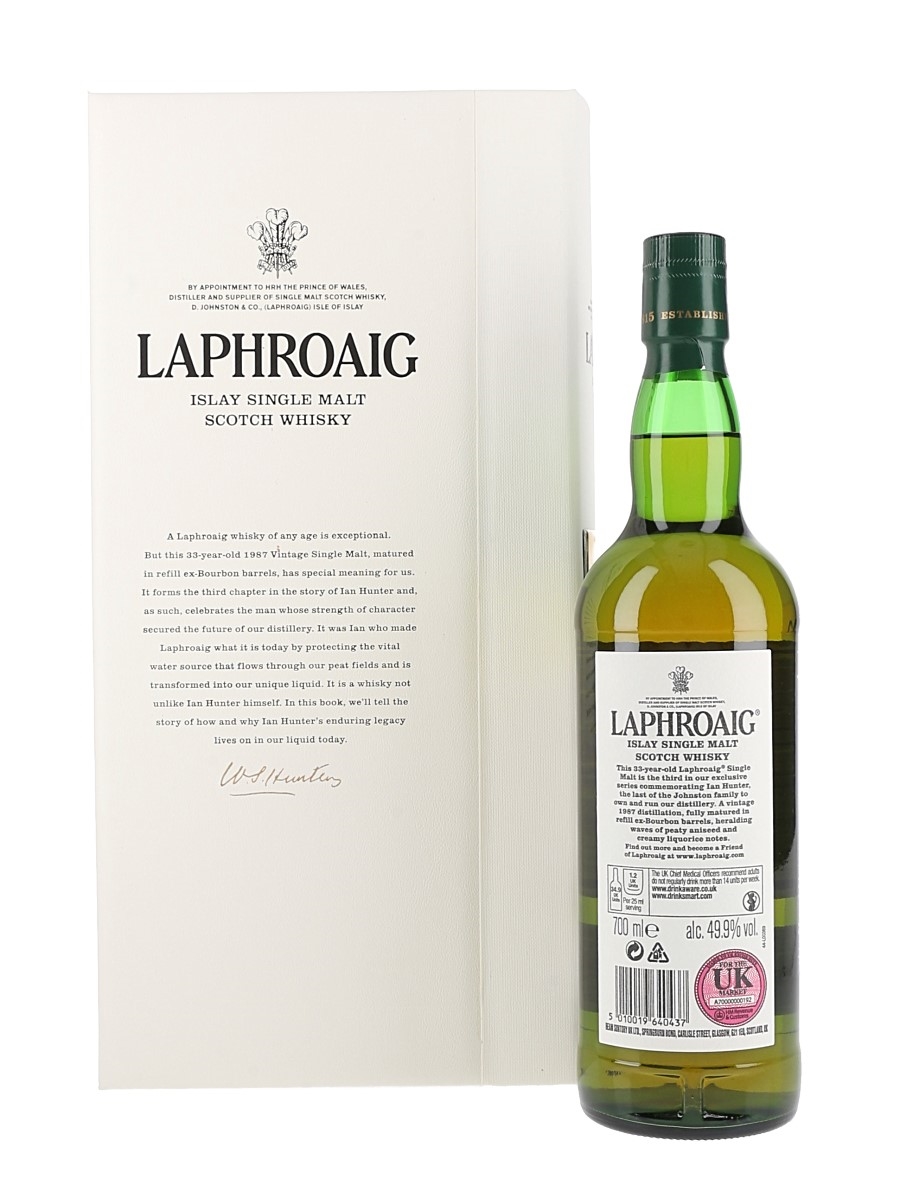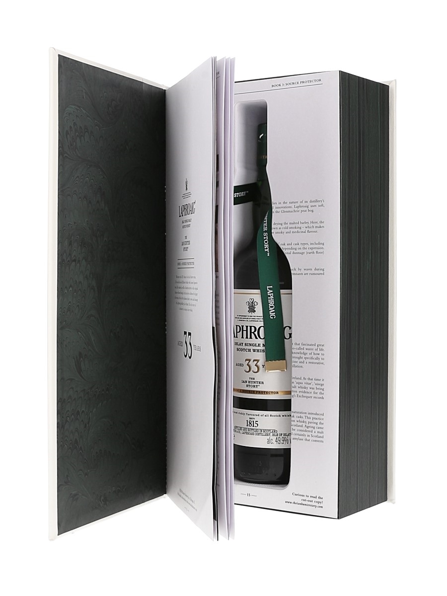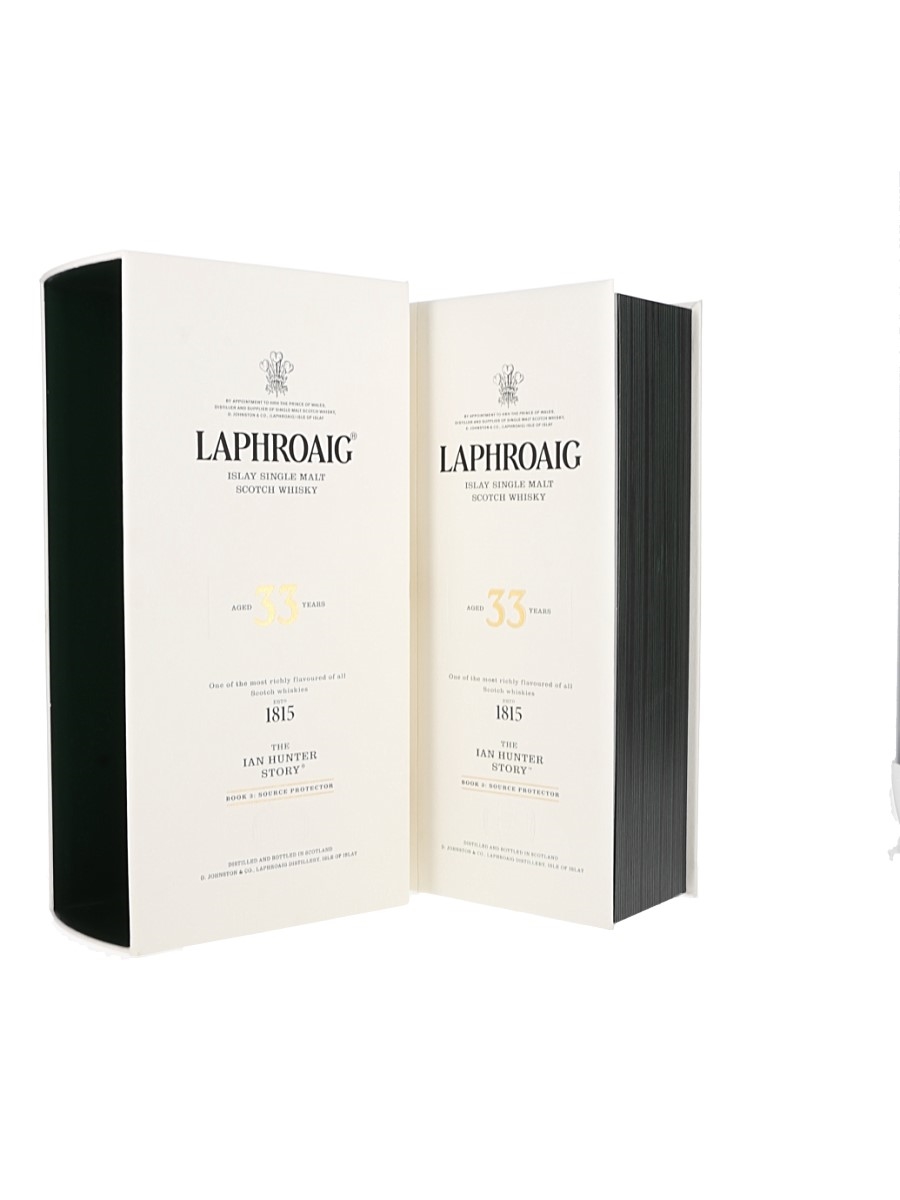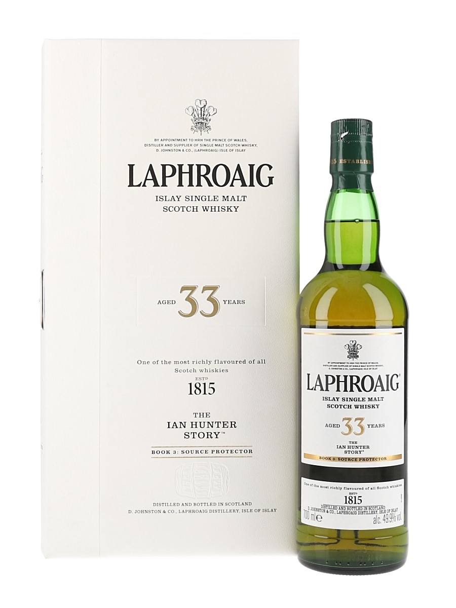 A bottle of Laphroaig 33 Year Old Islay Single Malt Scotch Whisky. This is the 2021 release in the Ian Hunter series which celebrates the legacy of the last of the Johnston family to own and manage the Laphroaig Distillery. This is Book 3: The Source Protector, and was fully matured in refill ex-Bourbon barrels and bottled at 49.9% ABV.