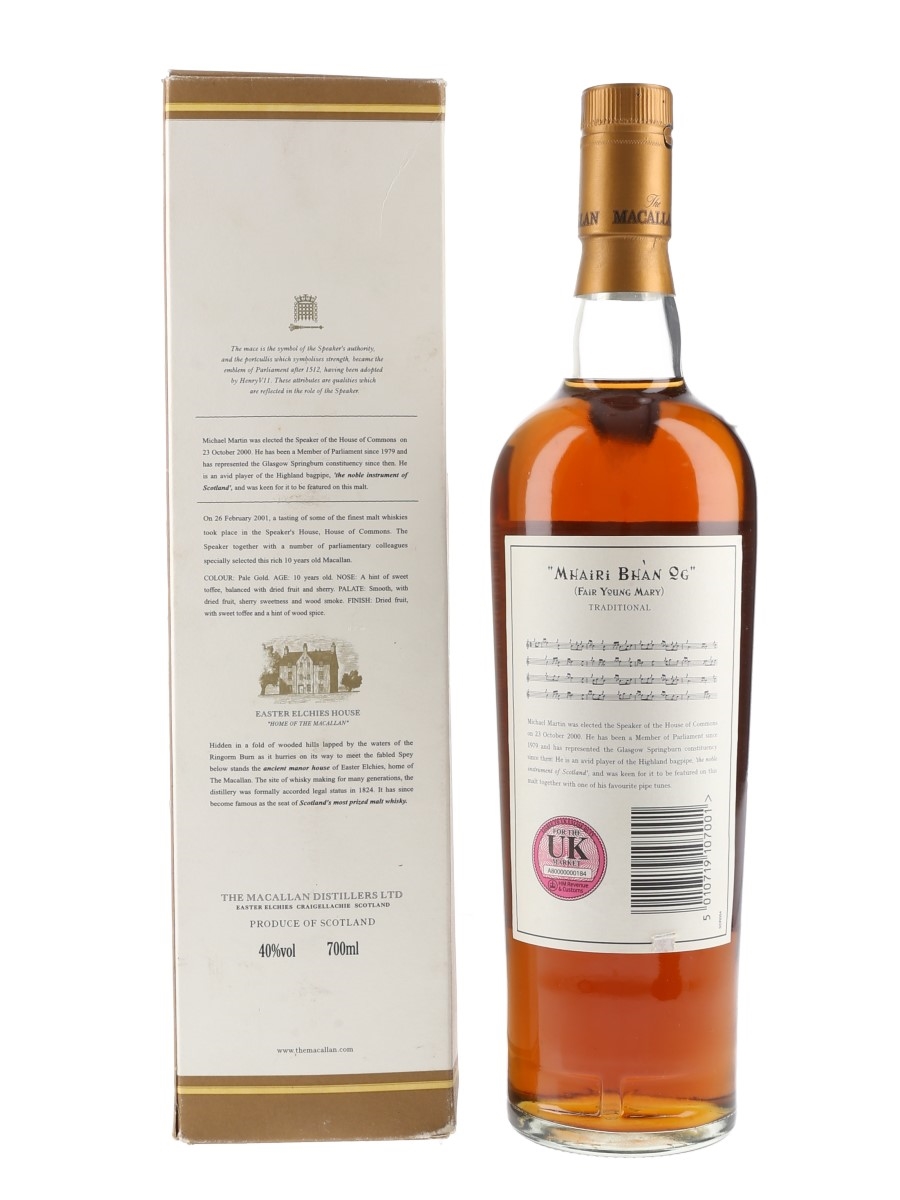 A bottle of The Macallan 10 Year Old Single Highland Malt Whisky, selected by former Speaker of the House of Commons Michael Martin for sale at the tourist shop in the Houses of Parliament.