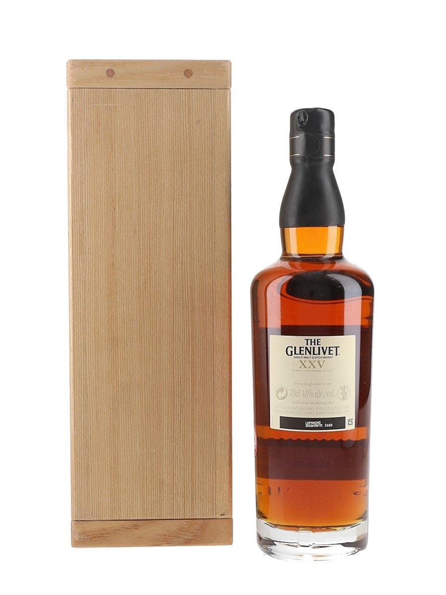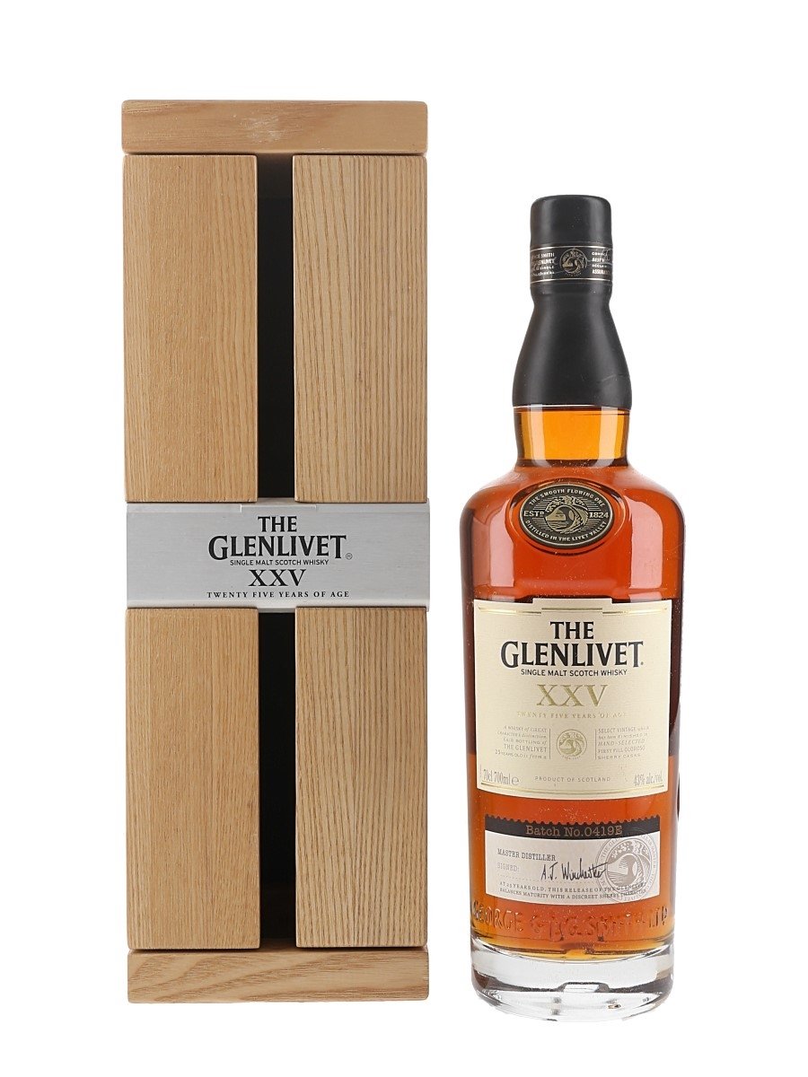 A bottle of Glenlivet XXV 25 Year Old Single Malt Scotch Whisky which spent its final maturation in a first fill oloroso sherry cask. This bottle is presented in a wooden case and secured with a metal plaque. This is from batch number 0419E. The bottling code indicates this was bottled on 21 August 2019.