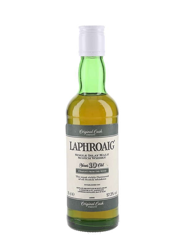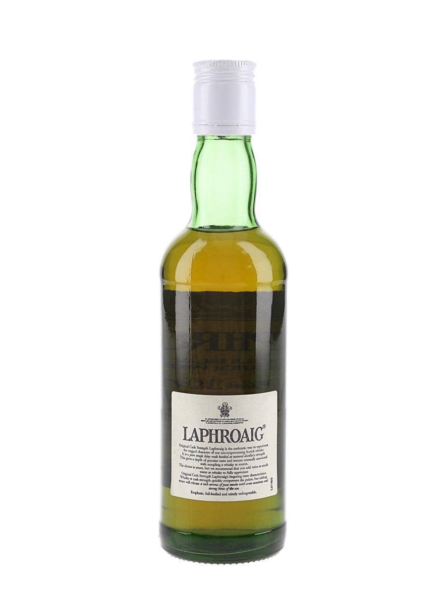 A half bottle of Laphroaig 10 Year Old Original Cask Strength Single Malt Scotch Whisky. We estimate this was bottled in the 2000s.