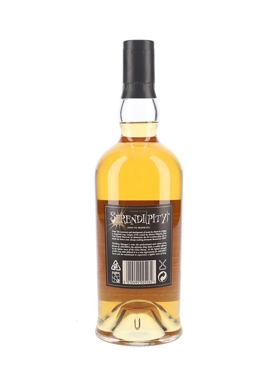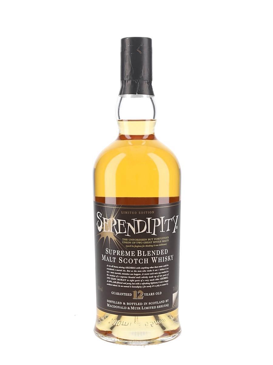 A bottle of Serendipity 12 Year Old Limited Edition Supreme Blended Malt Scotch Whisky. This is a blend of 20% 1992 Glen Moray and 80% much older Ardbeg, bottled by Macdonald & Muir Limited.