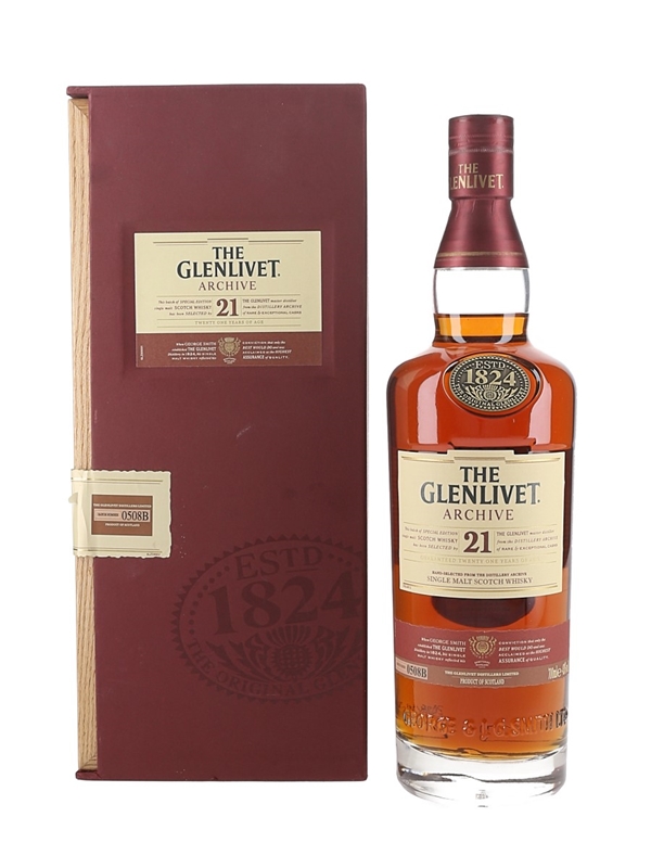 A bottle of Glenlivet Archive 21 Year Old Single Malt Scotch Whisky, in a wooden presentation case.