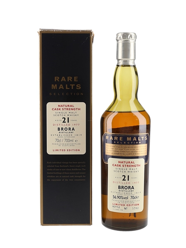 A bottle of Brora 21 Year Old Single Malt Scotch Whisky. This was distilled in 1977 and bottled in October 1998 for Diageo's now discontinued Rare Malts Selection range.