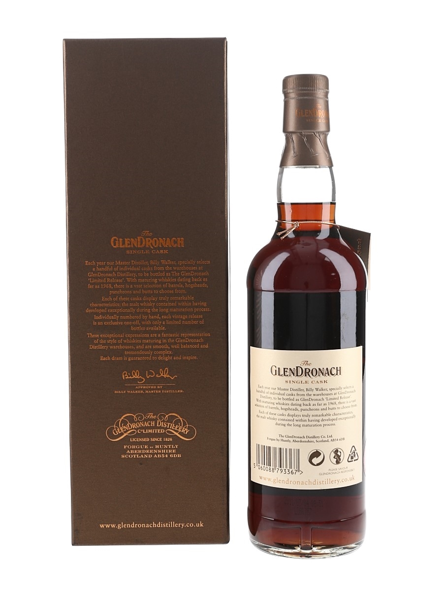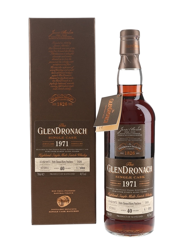A bottle of The Glendronach Single Cask Highland Single Malt Scotch Whisky. This was distilled on 25 February 1971, matured in a single Pedro Ximénez Sherry Puncheon cask for 40 years and bottled in July 2011 at 48.5% ABV.