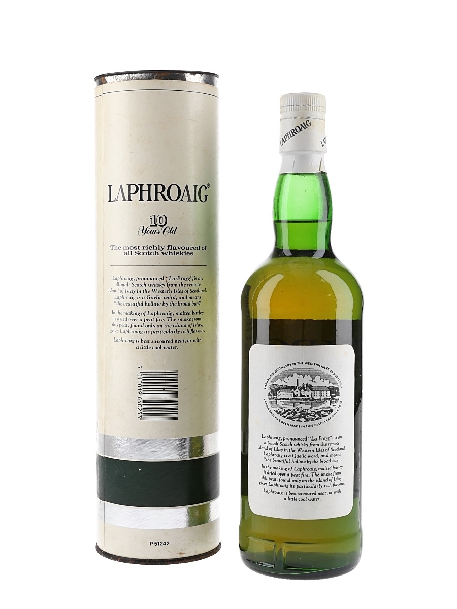 A bottle of Laphroaig 10 Year Old Single Islay Malt Scotch Whisky. We estimate this was bottled in the 1980s, before the distillery was awarded its royal warrant.