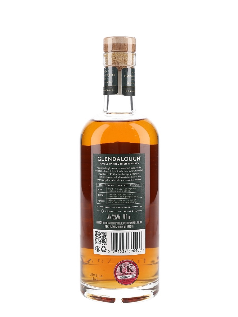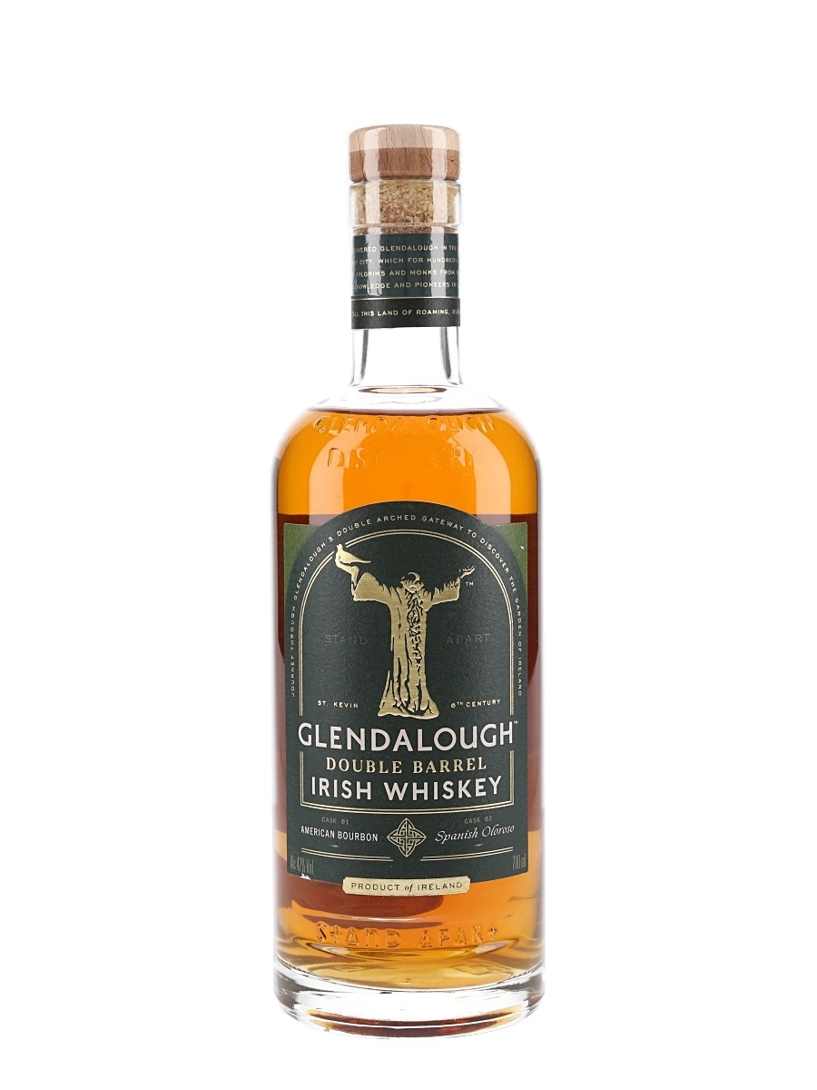 A bottle of Glendalough Double Barrel Irish single grain whiskey, matured in a marriage of American bourbon barrels, and finished in oloroso sherry barrels.