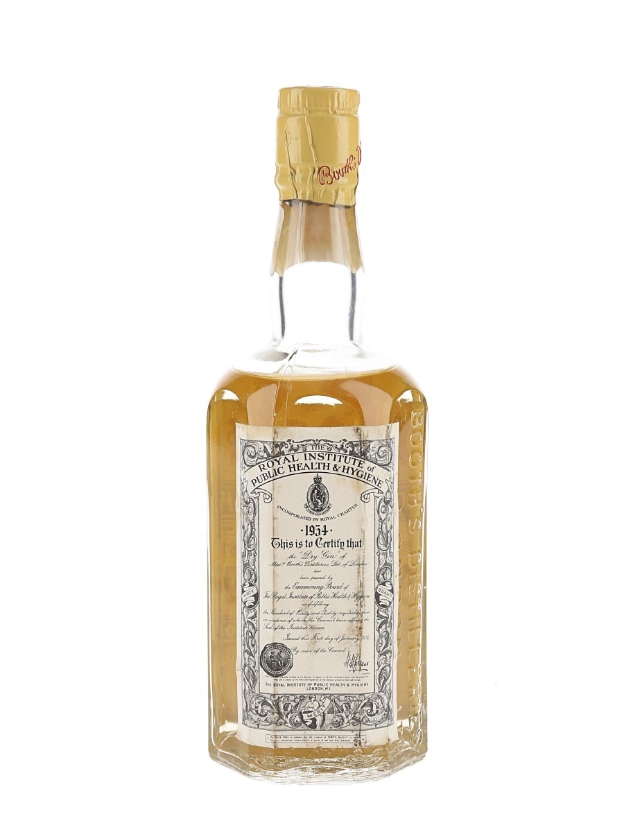 A 35cl bottle of Booth's Finest London Dry Gin, sealed with a cork stopper. The back label carries a certificate from The Royal Institute of Public Health & Hygiene dated 1954. The label carries a royal warrant by appointment to Her Majesty King George VI.