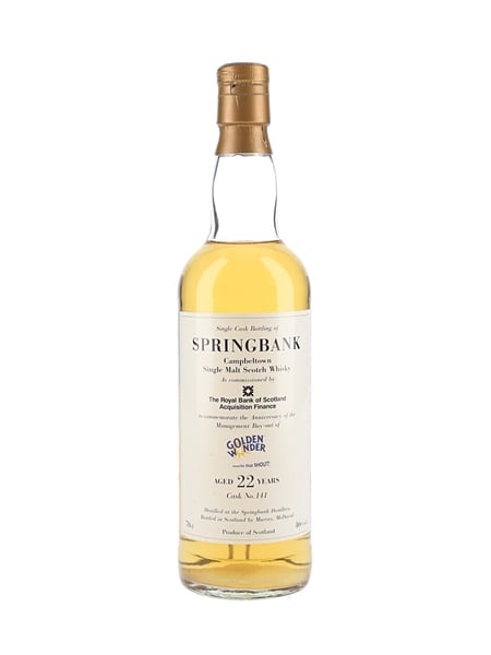 A bottle of Springbank 22 Year Old Campbeltown Single Malt Scotch Whisky. This was bottled by Murray McDavid and commissioned by the Royal bank of Scotland for the anniversary of the management buy out of Golden Wonder.