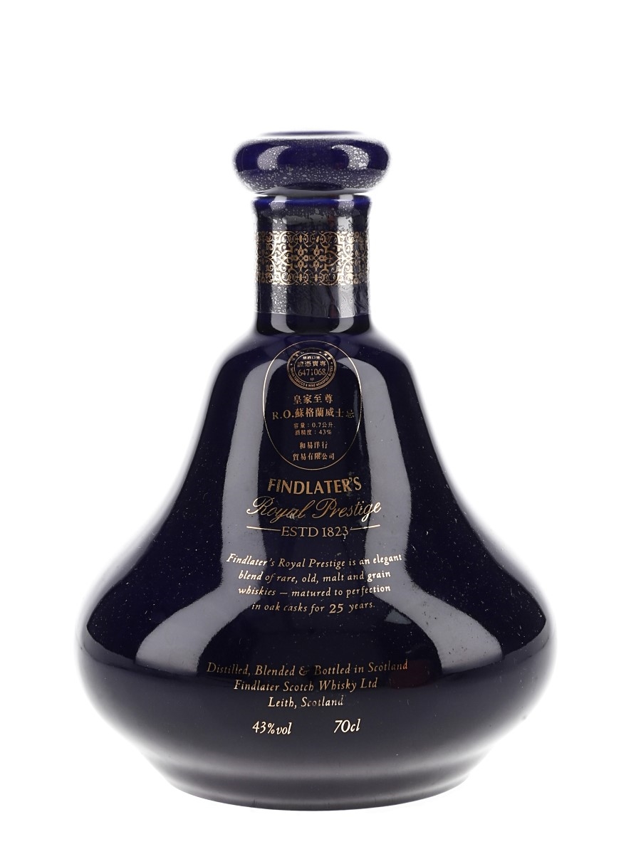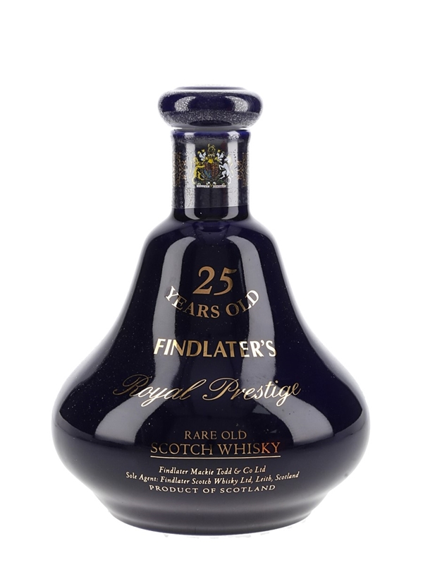 A bottle of Findlater's 25 Year Old Royal Prestige blended Scotch whisky, presented in a Wade Porcelain Decanter.
