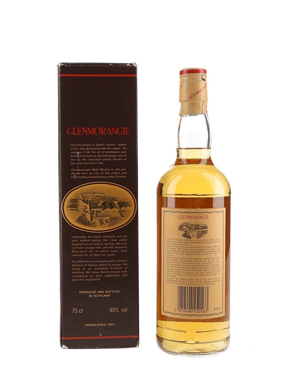 A bottle of Glenmorangie 10 Year Old Single Highland Malt Scotch whisky. We estimate this was bottle in the 1980s.