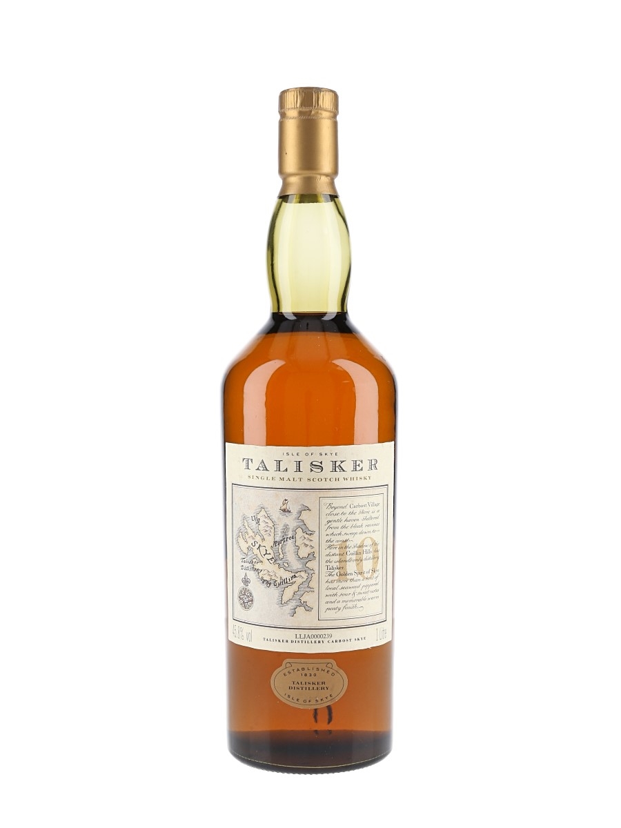 A litre bottle of Talisker 10 Year Old Single Malt Scotch Whisky with the label featuring a map of the Isle of Skye. We estimate this was bottled in the 1990s.